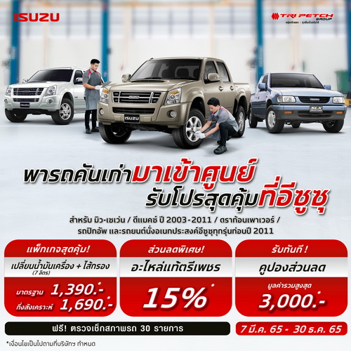 กลุ่มตรีเพชรโดย คุณวิชัย สินอนันต์พัฒน์ กรรมการ บริษัท ตรีเพชรอีซูซุเซลส์ จำกัด เชิญชวนลูกค้าอีซูซุมาตรวจเช็กสภาพรถให้พร้อมก่อนออกเดินทางเที่ยวปีใหม่ โดยขอมอบสิทธิพิเศษให้ลูกค้าผู้ใช้รถปิกอัพและรถยนต์นั่งอเนกประสงค์อีซูซุทุกรุ่นที่จำหน่ายก่อนปี ค.ศ. 2011 (อีซูซุดราก้อนเพาเวอร์ อีซูซุดีแมคซ์รุ่นปี ค.ศ. 2003 – 2011 และอีซูซุมิว-เซเว่น) เข้ารับบริการที่ศูนย์บริการมาตรฐานอีซูซุพร้อมรับโปรโมชั่นดีๆ ดังนี้