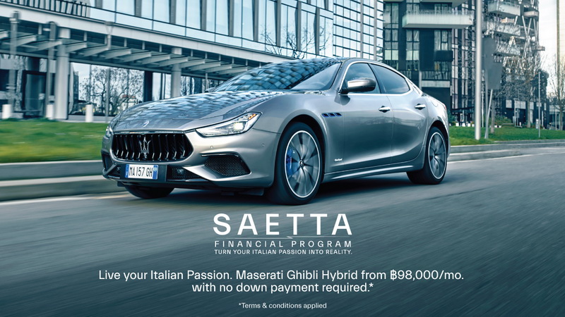 มาเซราติ ประเทศไทย ผู้นำเข้าและจำหน่ายรถยนต์ มาเซราติ อย่างเป็นทางการแต่เพียงผู้เดียวในประเทศไทย ภายใต้กลุ่มธุรกิจ มิลเลนเนียม กรุ๊ป คอร์ปอเรชั่น (เอเชีย) หรือ เอ็มจีซี-เอเชีย เปิดตัวโปรแกรมทางการเงินแบบใหม่ ‘SAETTA FINANCIAL PROGRAM’ กับสโลแกน ‘Turn Your Italian Passion Into Reality’ ทางเลือกอันชาญฉลาด ที่ช่วยให้คุณได้ขับรถยนต์ มาเซราติ ง่ายขึ้น รวมถึงมีหลากหลายสิทธิ์พิเศษอีกมาก ที่โชว์รูม มาเซราติ ประเทศไทย โครงการเอ-สแควร์ ซอยสุขุมวิท 26, สยามพารากอน ชั้น 2 และไอคอนสยาม ชั้น 1