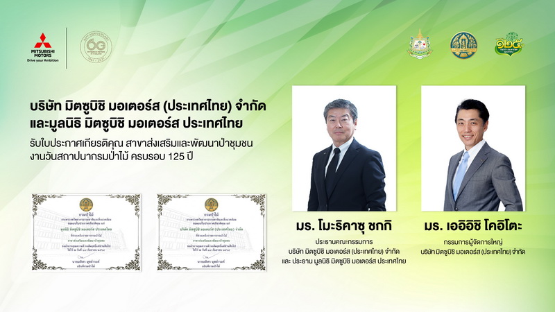 บริษัท มิตซูบิชิ มอเตอร์ส (ประเทศไทย) จำกัด นำโดย มร. โมะริคาซุ ชกกิ ประธานคณะกรรมการ บริษัท มิตซูบิชิ มอเตอร์ส (ประเทศไทย) จำกัด และ ประธาน มูลนิธิ มิตซูบิชิ มอเตอร์ส ประเทศไทย พร้อมด้วย มร. เออิอิชิ โคอิโตะ กรรมการผู้จัดการใหญ่ บริษัท มิตซูบิชิ มอเตอร์ส (ประเทศไทย) จำกัด รับใบประกาศเกียรติคุณ ผู้ช่วยเหลือราชการกรมป่าไม้ สาขาส่งเสริมและพัฒนาป่าชุมชน ประจำปี พ.ศ. 2564 จากกรมป่าไม้ กระทรวงทรัพยากรธรรมชาติและสิ่งแวดล้อม เนื่องในงานวันสถาปนากรมป่าไม้ ครบรอบ 125 ปี “รัฐมีป่า ประชามีสุข ยุควิถีใหม่”