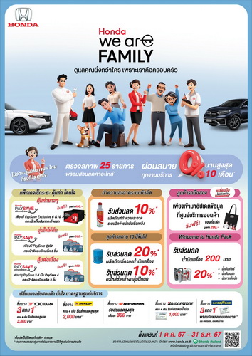 บริษัท ฮอนด้า ออโตโมบิล (ประเทศไทย) จำกัด ตอกย้ำการนำเสนอยนตรกรรมคุณภาพ พร้อมส่งมอบการบริการหลังการขายต่อเนื่องอย่างครบวงจรของเครือข่ายศูนย์บริการฮอนด้าทั่วประเทศที่ได้มาตรฐาน เปิดตัวแคมเปญพิเศษ “Honda, We are family เพราะเราคือครอบครัวฮอนด้า” เชิญชวนทั้งลูกค้ารถใหม่ ลูกค้ารถปัจจุบัน และลูกค้ารถมือสอง เข้ารับบริการที่ศูนย์บริการฮอนด้า 219 แห่งทั่วประเทศ ตั้งแต่วันที่ 1 ตุลาคม – 31 ธันวาคม 2567 เพื่อรับสิทธิประโยชน์พิเศษ* สำหรับครอบครัวฮอนด้า อาทิ บริการตรวจสภาพรถยนต์ฟรี 25 รายการ ฟรีของที่ระลึกจากฮอนด้า เมื่อลูกค้ามีแพ็กเกจ PaySave Exclusive 6, 10 หรือ PaySave อุ่นใจ หรือเพียงต่ออายุแพ็กเกจ PaySave เป็น PaySave 4 หรือ PaySave อุ่นใจ พร้อมส่วนลดอะไหล่พิเศษ และจัดเต็มกับโปรโมชันยางรถยนต์หลายยี่ห้อ ทั้งโยโกฮาม่า กู๊ดเยียร์ บริดจสโตน ดันลอป และฮันกุก สำหรับลูกค้ารถยนต์มือสองที่เข้ามารับบริการครั้งแรก รับของที่ระลึกและส่วนลดพิเศษ “Welcome to Honda Family” เพียงอัปเดตข้อมูลเจ้าของรถยนต์ใหม่และใช้บริการตามเงื่อนไข นอกจากนี้ ลูกค้ายังสามารถเลือกผ่อนสบาย 0% ทุกงานบริการ นานสูงสุด 8 เดือน และยางรถยนต์นานสูงสุด 10 เดือน อีกด้วย