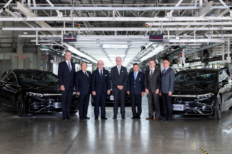 มร. โรลันด์ โฟล์เกอร์ (กลาง) ประธานบริหาร บริษัท เมอร์เซเดส-เบนซ์ (ประเทศไทย) จำกัด และ มร.มาร์ค เบอร์เกอร์ (ซ้ายสุด) ประธานบริหาร บริษัท เมอร์เซเดส-เบนซ์ แมนูแฟคเจอริ่ง (ประเทศไทย) จำกัด พร้อมทีมผู้บริหารเมอร์เซเดส-เบนซ์ ให้การต้อนรับตัวแทนจากหน่วยงานภาครัฐ นำโดย ม.ล.ชโยทิต กฤดากร (ที่ 3 จากซ้าย) ผู้แทนการค้าไทยและที่ปรึกษารองนายกรัฐมนตรี สำนักนายกรัฐมนตรี และนายกฤษฎา ทองธรรมชาติ (ที่ 3 จากขวา) ผู้อำนวยการสำนักงานศุลกากรกรุงเทพ กรมศุลกากร ที่ให้เกียรติมาร่วมแสดงความยินดีในโอกาสที่เมอร์เซเดส-เบนซ์เปิดตัวรถยนต์ “EQS 500 4MATIC AMG Premium” ยานยนต์พลังไฟฟ้า 100% รุ่นประกอบในประเทศไทย ล็อตแรกจากโรงงานอย่างเป็นทางการ โดยรถยนต์คันนี้รังสรรค์ขึ้นด้วยแพลตฟอร์มของยานยนต์ไฟฟ้าใหม่ในทุกรายละเอียด ทั้งการออกแบบโครงสร้างทางวิศวกรรม เรื่อยไปจนถึงดีไซน์ภายนอกและภายในที่สะท้อนเอกลักษณ์ของความเป็นยานยนต์สำหรับโลกอนาคตจากเมอร์เซเดส-เบนซ์