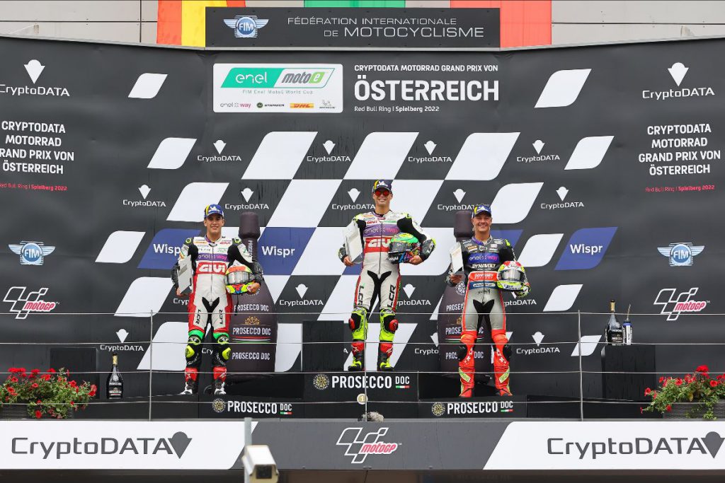 เป็นเกมที่สมบูรณ์แบบใน FIM Enel MotoE™ World Cup หลังจากที่ Eric Granado (LCR E-Team) คว้าชัยชนะสองรายการจากสองรายการที่ CryptoDATAMotorrad Grand Prix von Österreichดับเบิลของบราซิลที่ Red Bull Ring หมายความว่าเขาตาม Dominique Aegerter (Dynavolt Intact GP MotoE™) เพียง 17.5 คะแนนด้วยข้อเสนอ 50 ในรอบสุดท้ายที่ MisanoAegerterจบที่สามในการแข่งที่ 2 ในออสเตรียด้วยการผ่านเข้าโค้งสุดท้าย ในขณะที่ Miquel Pons อยู่เหนือนักบิดชาวสวิสเพื่อให้เป็น LCR E-Team 1-2