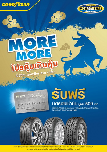 กู๊ดเยียร์ ประเทศไทย จัด 2 โปรโมชั่น ต้อนรับปีวัวสุดปัง กับ “More More” โปรคุ้มเกินคุ้ม มอบสิทธิพิเศษให้กับลูกค้า เมื่อซื้อยางกู๊ดเยียร์รุ่น “แอชชัวแรนซ์ ทริปเปิ้ลแมกซ์ 2”, “แรงเลอร์ ทริปเปิ้ลแมกซ์” และ “แรงเลอร์ เอที ไซเลนแทรค” ครบ 4 เส้น รับฟรีทันที บัตรเติมน้ำมัน มูลค่า 500 บาท และโปรสำหรับลูกค้าที่ซื้อยางกู๊ดเยียร์รุ่น “คาร์โก้ แมกซ์” ยางพรีเมี่ยมสำหรับรถกระบะและรถตู้ ครบ 4 เส้น รับทันทีบัตรกำนัลเทสโก้ โลตัส มูลค่า 400 บาท นอกจากนี้ยังได้รับสิทธิ์คุ้มครอง “Worry Free” อุ่นใจทุกที่ด้วยยางกู๊ดเยียร์ พร้อมดูแลฟรีตลอด 24 ชั่วโมง ทั่วไทย เมื่อซื้อยางกู๊ดเยียร์จากร้านกู๊ดเยียร์ ออโต้แคร์ และตัวแทนจำหน่ายที่เข้าร่วมรายการ ตั้งแต่วันที่ 1 กุมภาพันธ์ 2564 ถึง 31 มีนาคม 2564 หรือจนกว่าของแถมจะหมด เงื่อนไขเป็นไปตามที่บริษัทกำหนด