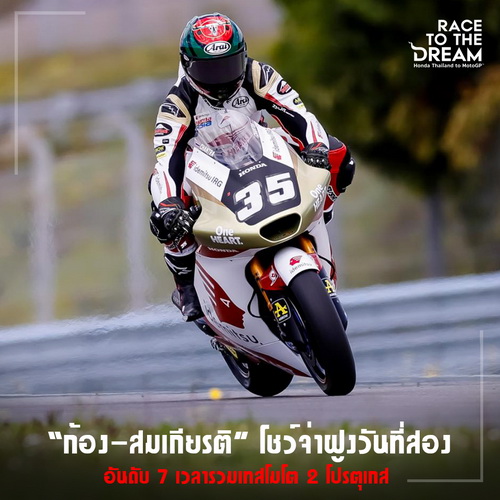 “ก้อง” สมเกียรติ จันทรา ยอดนักบิดไทยจากโครงการ “ฮอนด้า เรซ ทู เดอะ ดรีม” คว้าท็อป 7 ในเวลารวมของการทดสอบรุ่นโมโต 2 ที่ปอร์ติเมา ประเทศโปรตุเกส ตามโปรแกรมวันที่สอง เมื่อวันเสาร์ที่ 18 มีนาคมที่ผ่านมา แม้ว่าจะมีสายฝนรบกวนในเซสชั่นแรกแต่ทำผลงานได้อย่างยอดเยี่ยม และสามารถระเบิดฟอร์มด้วยการคว้าจ่าฝูงในเซสชั่นที่ 2 อีกด้วย