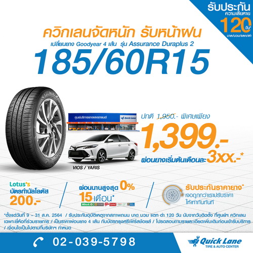 - เปลี่ยนยางกู๊ดเยียร์ 4 เส้น รุ่น Assurance Duraplus 2 ขนาด185/60R15 ราคาพิเศษเพียงเส้นละ 1,399 บาท จากราคาปกติ 1,950 บาท พร้อมรับสิทธิพิเศษมากมาย ทั้งบัตรกำนัลโลตัส มูลค่า 200 บาท การรับประกันความพึงพอใจ 14 วัน รับประกันความเสียหายของยาง ทั้งบาด บวม แตก ตำ 120 วัน บริการช่วยเหลือรถเสียฉุกเฉินตลอด 24 ชั่วโมงเป็นเวลา 1 ปี รับประกันคุณภาพยาง 5 ปี พร้อมฟรีบริการครบครัน ทั้งบริการถอดใส่และถ่วงล้อ 4 ล้อ เติมลมไนโตรเจนฟรีตลอดอายุการใช้งาน และฟรีสลับยางและถ่วงล้อตลอด 2 ปี หรือ 50,000 กม.