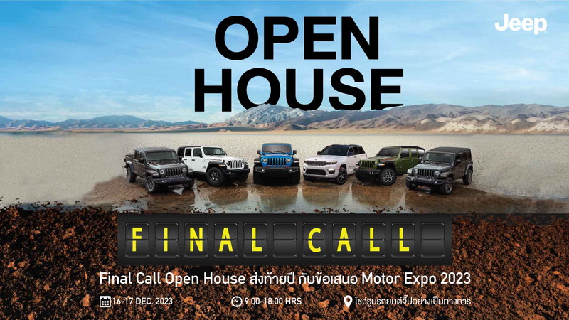 จี๊ป ประเทศไทย ผู้นำเข้าและจัดจำหน่ายรถยนต์ จี๊ป ราชาออฟ-โรดสัญชาติอเมริกัน อย่างเป็นทางการในประเทศไทย จัดกิจกรรมพิเศษ ‘Jeep Final Call Open House’ ชวนผู้หลงใหลยอดรถยนต์สายพันธุ์แกร่ง สัมผัสและทดลองขับรุ่นที่ใช่ พร้อมมอบความคุ้มค่าส่งท้ายปี จองสิทธิ์ซื้อและออกรถวันนี้ รับข้อเสนอเดียวกับ มอเตอร์ เอ็กซ์โป 2023 และอีกมากมาย เมื่อจองและรับมอบ จี๊ป แรงเลอร์ รูบิคอน และ จี๊ป กลาดิเอเตอร์ รูบิคอน ภายในวันที่ 29 ธันวาคม 2566 ประกันภัยชั้นหนึ่ง นาน 1 ปี อุปกรณ์ตกแต่ง Mopar มูลค่าสูงสุดถึง 200,000 บาทจองสิทธิ์ซื้อเอสยูวีพันธุ์แกร่ง ‘ออล-นิว แกรนด์ เชอเรอกี’ วันนี้ รับข้อเสนอเดียวกับ มอเตอร์ เอ็กซ์โป 2023 รวมมูลค่ากว่า 90,000 บาท Gift Voucher โรงแรมอินเตอร์คอนติเนนตัล หัวหิน 3 วัน 2 คืน มูลค่า 36,000 บาท ลำโพง McIntosh รุ่น RS150 Wireless Loudspeaker มูลค่า 57,000 บาท