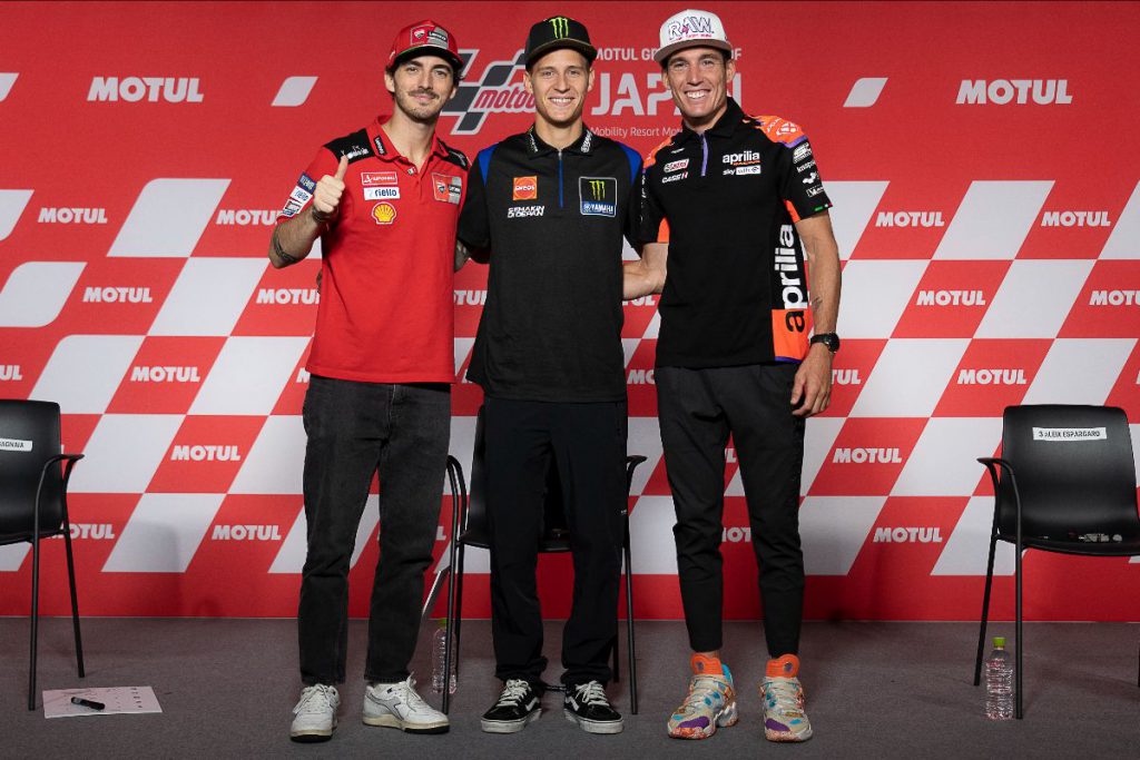 วันพฤหัสบดีของการแข่งขัน Motul Grand Prix ของญี่ปุ่นได้รวบรวมประเด็นพูดคุยมากมาย พร้อมงานแถลงข่าว 2 ครั้ง คนแรกคือนักแข่งสามคนแยกจากกันเพียง 17 คะแนน: Fabio Quartararo (Monster Energy Yamaha MotoGP™), Francesco Bagnaia (ทีม Ducati Lenovo) และ Aleix Espargaro (Aprilia Racing) ก่อนที่คนที่สองจะได้เห็น Enea Bastianini ผู้ชนะ MotorLand (Gresini Racing MotoGP™ ) เข้าร่วมโดยแชมป์โลกแปดสมัย Marc Marquez (ทีม Repsol Honda) และฮีโร่บ้าน Takaaki Nakagami (LCR Honda Idemitsu)