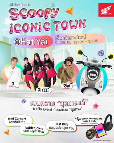 ไทยฮอนด้า เตรียมขนขบวนความสนุก บุกถึงชาวหาดใหญ่กับงาน ‘SCOOPY iCONiC TOWN’ สนุก ไปให้สุดเทรนด์กับมินิคอนเสิร์ต นำทีมโดยเกิร์ลกรุ๊ปไอคอนิก ‘PiXXiE’ พรีเซนเตอร์ใหม่ล่าสุดของรถจักรยานยนต์รุ่น ‘All New Honda SCOOPY’ และตามด้วยนักร้องสุดคิวท์อย่าง ‘นุนิว-ชวรินทร์’ เจ้าของรางวัล ‘ขวัญใจมหาชน’ และเสริมทัพด้วยหนุ่มนักร้องสุดฮอตอย่าง ‘PUN’ เจ้าของเพลงฮิตอย่าง ‘Day One’ เตรียมพบกันในวันที่ 6 เมษายน 2568 ณ ลานหน้าศูนย์การค้า เซ็นทรัล หาดใหญ่