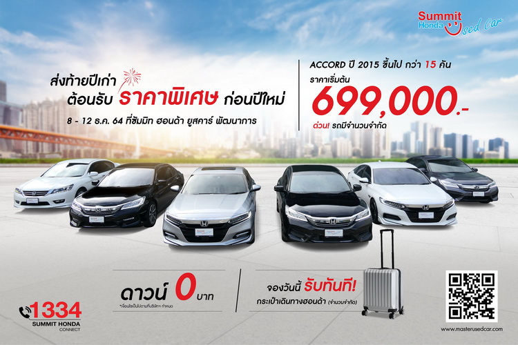 ซัมมิท ฮอนด้า ยูสคาร์ ศูนย์รวมรถยนต์ ฮอนด้า มือสองครบวงจร ภายใต้กลุ่มธุรกิจ มิลเลนเนียม กรุ๊ป คอร์ปอเรชั่น (เอเชีย) มอบของขวัญปีใหม่ให้ลูกค้า กับโอกาสในการจับจองรถผู้บริหาร ฮอนด้า แอคคอร์ด ปี 2015 ขึ้นไป ครบทุกรุ่น…ทุกปีในที่เดียว รวมกว่า 15 คัน ระหว่างวันที่ 8-12 ธันวาคมนี้ ที่โชว์รูม ซัมมิท ฮอนด้า ยูสคาร์ สาขาพัฒนาการ