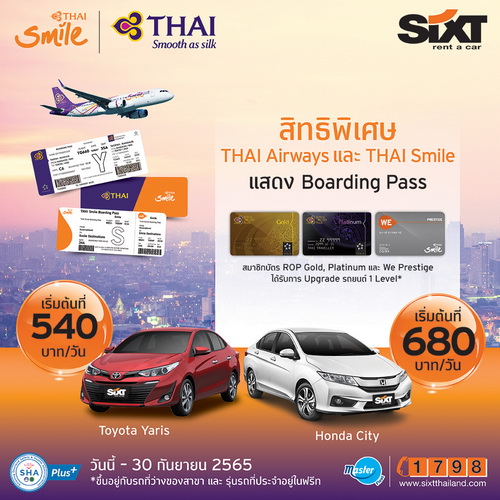 ซิกท์ รถเช่า ประเทศไทย หนึ่งในผู้นำบริการรถเช่าระยะสั้น ภายใต้กลุ่มธุรกิจ มิลเลนเนียม กรุ๊ป คอร์ปอเรชั่น (เอเชีย) หรือ เอ็มจีซี-เอเชีย ให้บริการด้วยมาตรฐานด้านสุขอนามัยสูงสุด ภายใต้ตราสัญลักษณ์ SHA และ SHA Plus ผนึกกำลัง การบินไทย และ ไทยสมายล์ ร่วมแคมเปญ ‘2 ศรี มีโปร’ ขอมอบส่วนลดสูงสุด 55% สำหรับรถเช่าขับเองทั่วไทย และส่วนลดสูงสุด 40% สำหรับ ลีมูซีน เซอร์วิส รับ-ส่ง สนามบิน เพียงแสดงบัตรโดยสารของการบินไทย หรือ ไทยสมายล์ และยิ่งไปกว่านั้น สำหรับสมาชิก รอยัล ออร์คิด พลัส บัตรแพลทินัมและบัตรทอง รวมถึงสมาชิกบัตร WE Prestige รับสิทธิ์การอัพเกรดสำหรับรถเช่าขับเอง 1 ระดับ วันนี้ ถึงสิ้นเดือนกันยายน 2565