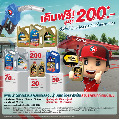 บริษัท เชฟรอน (ไทย) จำกัด ผู้นำอุตสาหกรรมด้านพลังงานระดับโลก เจ้าของแบรนด์น้ำมันเครื่องคาลเท็กซ์ ฮาโวลีน คาลเท็กซ์ เดโล่ และผลิตภัณฑ์เทครอนสำหรับเครื่องยนต์เบนซินและดีเซล จัดโปรโมชั่นเด็ดรับคลายล็อกดาวน์ เพียงซื้อผลิตภัณฑ์น้ำมันเครื่องคาลเท็กซ์ที่ร่วมรายการ ทั้งเดโล่ สปอร์ต เดโล่ โกลด์ อัลตร้า และฮาโวลีนที่สถานีบริการน้ำมัน คาลเท็กซ์ รับทันทีส่วนลดค่าน้ำมันเชื้อเพลิงทุกประเภท สูงสุด 200 บาท (จำกัดการใช้ส่วนลด 1 สิทธิ์ ต่อ 1 ใบเสร็จ ต่อ การเติมน้ำมัน 1 ครั้ง) ตั้งแต่วันนี้ จนถึงวันที่ 30 พฤศจิกายน 2564 หรือจนกว่าสินค้าที่มีคูปองส่วนลดใต้ฉลากบรรจุภัณฑ์จะหมด (สามารถใช้คูปองส่วนลดได้ถึง 31 มีนาคม 2565)