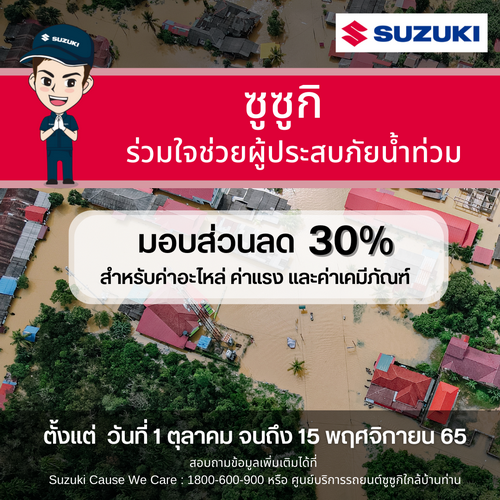บริษัท ซูซูกิ มอเตอร์ (ประเทศไทย) จำกัด ตอกย้ำความใส่ใจในการดูแลลูกค้าทั้งก่อนและหลังการขาย มีความตระหนักถึงความเดือดร้อนของประชาชนในพื้นที่ที่ได้รับผลกระทบจากเหตุอุทกภัยในวงกว้าง จึงได้ร่วมมือกับผู้จำหน่ายรถยนต์ซูซูกิจัดแคมเปญมอบส่วนลดพิเศษ 30% สำหรับค่าอะไหล่ ค่าแรง และค่าเคมีภัณฑ์ ให้แก่ลูกค้ารถยนต์ซูซูกิทุกรุ่นที่ได้รับผลกระทบซึ่งอยู่ในพื้นที่ประสบอุทกภัยทั่วประเทศ ยกเว้นแบตเตอรี่ หัวเทียน ยางรถยนต์ และอุปกรณ์ตกแต่ง และเฉพาะลูกค้ารถยนต์ซูซูกิที่ไม่มีประกันภัยรถยนต์เท่านั้นโดยลูกค้ารถยนต์ซูซูกิที่ได้รับผลกระทบจากเหตุอุทกภัยสามารถติดต่อนัดหมายจองคิวเข้ารับบริการที่ศูนย์บริการมาตรฐานของผู้จำหน่ายรถยนต์ซูซูกิ หรือโทรสอบถามข้อมูลเพิ่มเติมที่ SUZUKI Cause We Care: 1800-600-900 (ฟรีค่าใช้จ่าย) ได้ตั้งแต่วันที่ 1 ตุลาคม 2565 ถึงวันที่ 15 พฤศจิกายน 2565