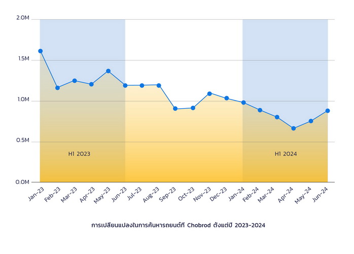 ในสถานการณ์เศรษฐกิจทั่วไปที่ยากลำบากส่งผลให้ความต้องการซื้อรถยนต์ในประเทศไทยลดลงตั้งแต่เดือนสิงหาคม 2566 การค้นหารถยนต์มือสองลดลงต่อเนื่องตั้งแต่ช่วงครึ่งหลังของปี 2566 จนถึงเดือนเมษายน 2567 เหลือเพียง 660,000 ครั้ง แต่ตั้งแต่เดือนพฤษภาคม 2567 เศรษฐกิจเริ่มดีขึ้น การท่องเที่ยวและการใช้จ่ายส่วนบุคคลเพิ่มขึ้นเล็กน้อย ส่งผลให้ความต้องการรถยนต์ก็เริ่มเพิ่มขึ้นตามไปด้วย ไม่น่าแปลกใจที่แบรนด์รถยนต์ที่คนไทยค้นหาเยอะที่สุดส่วนใหญ่เป็นรถยนต์จากญี่ปุ่น โดย Toyota นำโด่งด้วยการค้นหา 25.6% ตามด้วย Honda และ Isuzu ที่มีการค้นหา 16.5% และ 7.2% ตามลำดับ