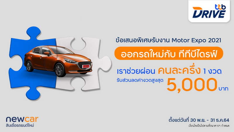 ทีทีบีไดรฟ์ (ttb DRIVE) สนับสนุนให้ลูกค้ามีชีวิตทางการเงินที่ดีขึ้น จัดโปรโมชันสุดพิเศษส่งท้ายปี ในงาน Motor Expo 2021 เมื่อออกรถยนต์ใหม่กับสินเชื่อรถยนต์ ttb DRIVE รับข้อเสนอสุดพิเศษ ช่วยผ่อนชำระค่างวด คนละครึ่ง หนึ่งงวด สูงสุด 5,000 บาท สำหรับลูกค้าที่ ชำระค่างวดติดต่อกันครบ 3 งวดแรกเต็มจำนวน และไม่เกินวันครบกำหนดชำระตามที่ระบุในสัญญาเช่าซื้อรถยนต์ เพียงสมัครสินเชื่อรถยนต์ใหม่ ttb DRIVE เปิดบัญชีทีทีบี ออลล์ฟรี (ttb all free) สมัครและเข้าใช้งานแอปพลิเคชัน ทีทีบี ทัช (ttb touch) ตั้งแต่ วันที่ 30 พ.ย. 64- 31 ธ.ค. 64 และได้รับการอนุมัติพร้อมทำสัญญาเช่าซื้อ ภายในวันที่ 28 ก.พ. 65 ทั้งภายในงานและทั่วประเทศ พร้อมรับฟรี ประกันอุบัติเหตุ (PA) วงเงินคุ้มครอง 30,000 บาท