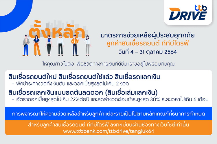 ทีทีบีไดรฟ์ (ttb DRIVE) ส่งมอบความห่วงใยลูกค้าสินเชื่อรถยนต์ และพร้อมช่วยเหลือในยามลูกค้าประสบปัญหาต่าง ๆ เพื่อสนับสนุนให้ลูกค้ามีชีวิตทางการเงินที่ดีขึ้น โดยได้ออกมาตรการ ‘ตั้งหลัก’ ให้ความช่วยเหลือลูกค้าที่ได้รับผลกระทบจากเหตุอุทกภัยที่เกิดจากร่องมรสุม-พายุเตี้ยนหมู่ ทั้งสินเชื่อรถยนต์ใหม่ สินเชื่อรถยนต์ใช้แล้ว สินเชื่อรถแลกเงิน และสินเชื่อเล่มแลกเงิน สามารถขอพักชำระค่างวด ลดค่างวดและผ่อนชำระ ตั้งแต่วันนี้ ถึง 31 ตุลาคม 2564
