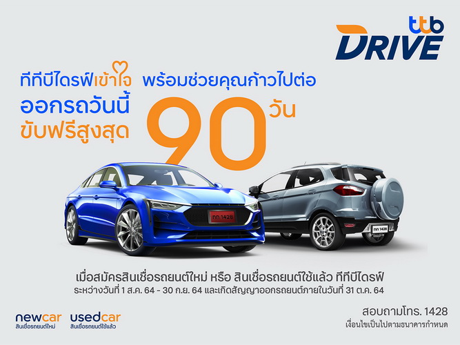ทีทีบีไดรฟ์ (ttb DRIVE) พร้อมขับเคลื่อนให้คนไทยเดินหน้าต่อ ท่ามกลางสถานการณ์เศรษฐกิจชะลอตัว โดยลูกค้าที่มีความจำเป็น หรือต้องการออกรถ ไม่ว่าจะรถยนต์ใหม่ หรือรถยนต์ใช้แล้ว เมื่อสมัครสินเชื่อรถยนต์ใหม่ หรือ สินเชื่อรถยนต์ใช้แล้ว ทีทีบีไดรฟ์ ตั้งแต่วันนี้ ถึง 30 กันยายน 2564 และเกิดสัญญาออกรถยนต์ภายใน 31 ตุลาคม 2564 รับสิทธิ์ขับฟรีสูงสุด 90 วัน พร้อมรับดอกเบี้ยต่ำ วงเงินสูง อนุมัติไว
