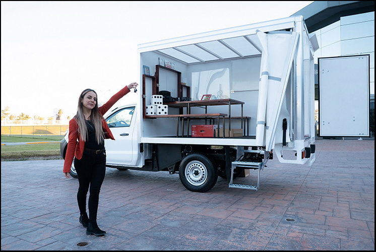 กระบะบรรทุกของ นิสสัน เอ็นพี 300 ถูกปรับให้เป็นห้องเรียนที่มีผนังสามด้านพร้อมบันไดทางขึ้นแบบพับเก็บได้ ส่วนผนังอีกฝั่งเป็นม่านไว้คอยกันแดดกันฝน โต๊ะและม้านั่งทำจากวัสดุอะคริลิกซึ่งทำความสะอาดง่าย พร้อมฉากกั้นอะคริลิกระหว่างครูและนักเรียนตามมาตรการป้องกันโควิด-19 นอกจากนี้ยังมีพื้นที่สำหรับจัดเก็บสื่อการสอน และอุปกรณ์ต่าง ๆ และพื้นที่ห้องเรียนที่สว่างสดใสด้วยหลังคาโปร่งแสง ฟลอเรสใช้เวลาสี่ชั่วโมงต่อวันในการเดินทางไปหานักเรียน แต่รถคันใหม่นี้จะช่วยลดเวลาเดินทาง และการสอนในห้องเรียนใหม่ก็สะดวกสบายและมีประสิทธิภาพมากยิ่งขึ้น