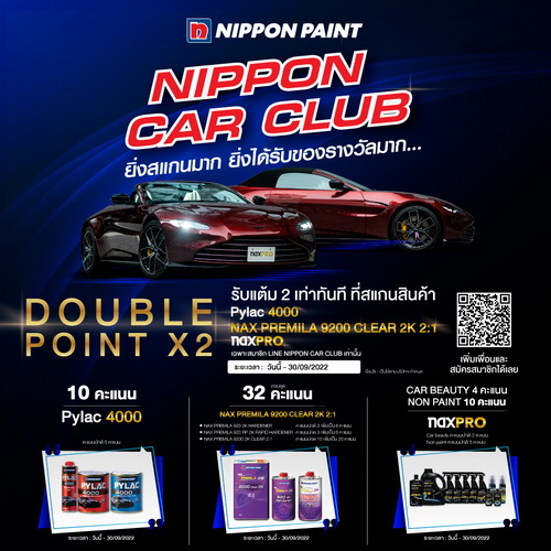 คุ้มสุดๆ งานนี้จัดเต็ม กับผู้นำด้านสีพ่นรถยนต์ กับคอนเซ็ป Beauty Mobility อย่าง บริษัท นิปปอนเพนต์ (ประเทศไทย) จำกัด หน่วยธุรกิจสีพ่นซ่อมรถยนต์ จัดแคมเปญ “DOUBLE POINT รับคะแนน X 2” ง่ายๆรับแต้ม 2 เท่าทันที สำหรับลูกค้าที่สแกน QR Code สะสมแต้ม สำหรับสินค้า Pylac 4000, NAX PREMILA 9200 CLEAR 2K , Naxpro Car beauty, Naxpro Non Paint ผ่านทางฟีเจอร์เพื่อคนรักรถ “Nippon Car Club” กับแพลตฟอร์มยอดนิยม “LINE” รูปแบบ lifestyle innovation มุ่งมอบสิทธิประโยชน์ และคืนกำไรให้ลูกค้าสีพ่นรถยนต์แบบครบวงจร ตั้งแต่วันนี้ – 30 กันยายน 2565