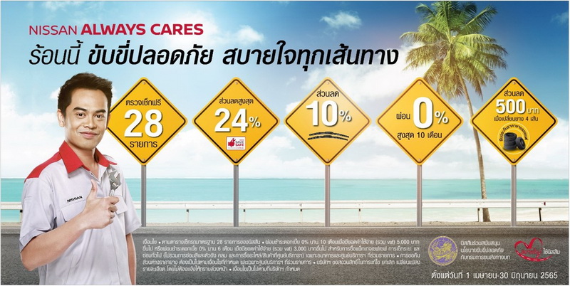 นิสสัน ประเทศไทย ส่งความห่วงใยผ่านแคมเปญ “Nissan Always Cares ร้อนนี้ ขับขี่ปลอดภัย สบายใจทุกเส้นทาง” ชวนลูกค้าเตรียมความพร้อมก่อนเดินทางไกลในช่วงหยุดยาวที่กำลังจะมาถึงนี้ ด้วยโปรโมชั่นตรวจเช็คฟรี 28 รายการ พร้อมทั้งบริการล้างรถ ดูดฝุ่น ฉีดพ่นน้ำยาฆ่าเชื้อภายในรถยนต์ ฟรี และส่วนลดพิเศษอื่น ๆ อีกมากมาย ตั้งแต่วันที่ 1 เมษายน – 30 มิถุนายน 2565