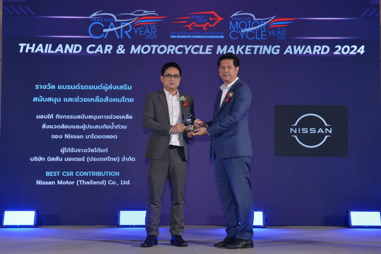 นิสสัน ประเทศไทย ขึ้นรับรางวัล Best CSR Contribution จาก สมาคมผู้สื่อข่าวรถยนต์และรถจักรยานยนต์ไทย ในพิธีมอบรางวัล Thailand Car of the Year 2024 สะท้อนความมุ่งมั่นของนิสสันที่มีต่อสังคมไทย ผ่านการดำเนินกิจกรรมช่วยเหลือสังคมที่นิสสันทำมาตลอด 71 ปีที่ผ่านมา รวมถึงการร่วมมือกับผู้จำหน่ายนิสสันในการช่วยเหลือฟื้นฟูเมือง และความเป็นอยู่ของประชาชนในจังหวัดเขียงรายหลังอุทกภัยครั้งร้ายแรงที่สุดในประวัติศาสตร์ของจังหวัดเชียงราย นิสสัน ได้ดำเนินกิจกรรมเพื่อสังคมมาโดยตลอด ล่าสุดได้ร่วมมือกับผู้จำหน่ายนิสสันในภาคเหนือ โดยนำทีมพนักงานนิสสันภาคเหนือร่วมฟื้นฟู ทำความสะอาด และนำของใช้จำเป็นบริจาคให้แก่โรงเรียนชุมชนบ้านไม้ลุงขน มิตรภาพที่ 169 ใน อ.แม่สาย จังหวัดเชียงราย และสำนักงานป้องกัน และบรรเทาสาธารณภัยจังหวัดเชียงราย เพื่อร่วมใจช่วยชาวเชียงรายฟื้นฟูเมือง และความเป็นอยู่หลังน้ำท่วมครั้งใหญ่ให้คืนกลับสู่ภาวะปกติโดยเร็วที่สุด