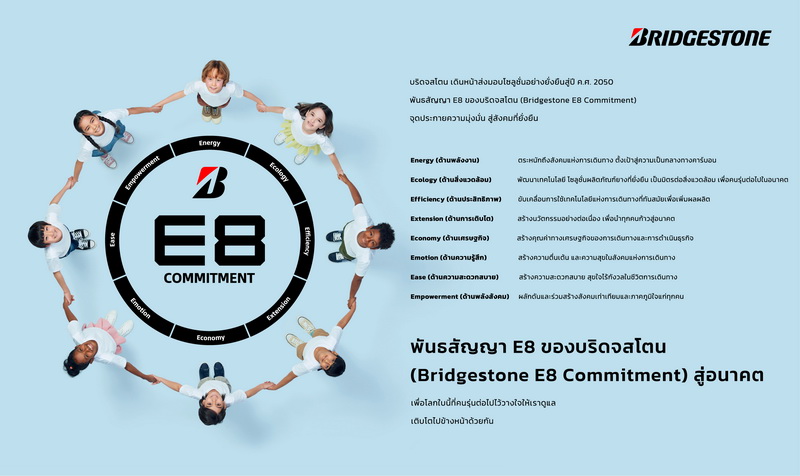 บริดจสโตน คอร์ปอเรชั่น ประกาศ “พันธสัญญา E8 (อี-เอ็ท) ของบริดจสโตน (Bridgestone E8 Commitment)” ซึ่งเป็นพันธสัญญาขององค์กรสู่ปี ค.ศ. 2030 เนื่องในโอกาสฉลองครบรอบ 91 ปี ของการก่อตั้งองค์กร “พันธสัญญา E8 ของบริดจสโตน” ประกอบด้วยคุณค่า 8 ด้าน ที่เริ่มต้นด้วยตัวอักษร E (ได้แก่ Energy ด้านพลังงาน, Ecology ด้านสิ่งแวดล้อม, Efficiency ด้านประสิทธิภาพ, Extension ด้านเติบโต, Economy ด้านเศรษฐกิจ, Emotion ด้านความรู้สึก, Ease ด้านความสะดวกสบาย และ Empowerment ด้านพลังสังคม) ซึ่งกลุ่มบริษัทในเครือบริดจสโตนจะมุ่งมั่นสร้างสรรค์ผ่าน “เจตจำนง” และ “กระบวนการทำงาน” ร่วมกับพนักงาน สังคม พันธมิตร และลูกค้าเพื่อสังคมที่ยั่งยืน