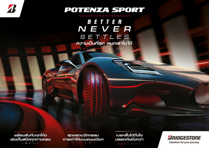 บริดจสโตน เปิดตัวผลิตภัณฑ์ “POTENZA Sport” รุ่นเรือธงใหม่ ภายใต้สโลแกน “ความเป็นที่สุด หยุดเราไม่ได้” หรือ “Better Never Settles” ที่ได้รับการออกแบบโดยใช้เทคโนโลยียางอันล้ำสมัยและให้สมรรถนะการยึดเกาะถนนที่เหนือกว่า ภายใต้การควบคุมอย่างเต็มประสิทธิภาพ จัดเต็มสมรรถนะครบทุกฟังก์ชันแห่งความสปอร์ตในทุกการขับขี่