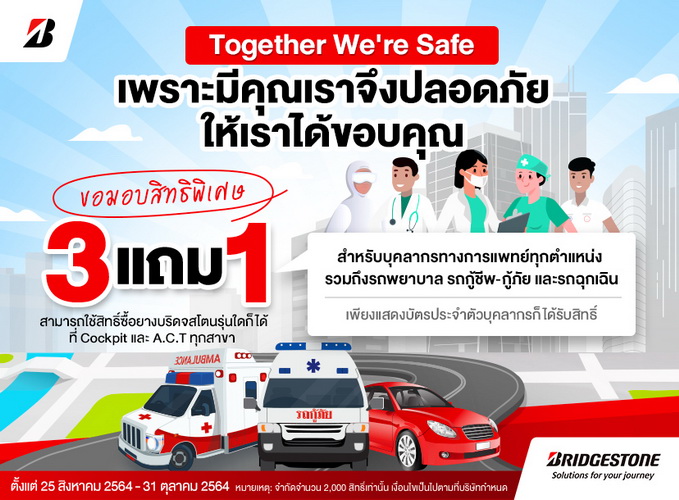 บริษัท บริดจสโตนเซลส์ (ประเทศไทย) จํากัด ร่วมกับศูนย์บริการค็อกพิท และ เอ.ซี.ที ทั่วประเทศ ขอร่วมเป็นส่วนหนึ่งเพื่อช่วยเหลือบุคลากรด่านหน้า ในแคมเปญ Together We’re Safe มอบสิทธิพิเศษสำหรับบุคลากรทางการแพทย์ รวมถึงรถพยาบาล รถกู้ชีพ-กู้ภัย และรถฉุกเฉิน ร่วมสู้ภัยโควิด-19 ด้วยการจัดโปรโมชั่นซื้อยางบริดจสโตน 3 เส้น ทุกรุ่น ทุกขนาด แถมฟรี 1 เส้น* และสำหรับลูกค้าทั่วไป บริดจสโตนมอบข้อเสนอพิเศษเพียงลงทะเบียนรับสิทธิ์ผ่านทาง LINE @bridgestoneth จะได้รับส่วนลดมูลค่า 1,000 บาท ทาง SMS สำหรับการเปลี่ยนยาง บริดจสโตน 4 เส้น โดยแคมเปญ Together We’re Safe จะเริ่มตั้งแต่วันที่ 25 สิงหาคม – 31 ตุลาคม 2564
