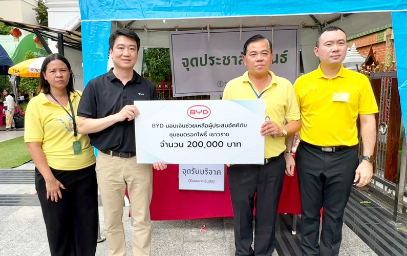 บริษัท บีวายดี ออโต้ (ประเทศไทย) จำกัด ได้ทำการมอบเงินช่วยเหลือผู้ประสบอัคคีภัยในชุมชนตรอกโพธิ์ เยาวราช จำนวน 200,000 บาท โดยมี นายประวิทย์ วิจิตรธนกูล ผู้จัดการฝ่ายการพาณิชย์ บริษัท บีวายดี ออโต้ (ประเทศไทย) จำกัด ตัวแทนจากบริษัทฯ (ด้านซ้าย) เป็นผู้ส่งมอบเงินช่วยเหลือในครั้งนี้ โดยมีนายวัลลภ เกียรติวรศรีกุล ผู้อำนวยการเขตสัมพันธวงศ์ (ด้านขวา) เป็นผู้รับมอบ