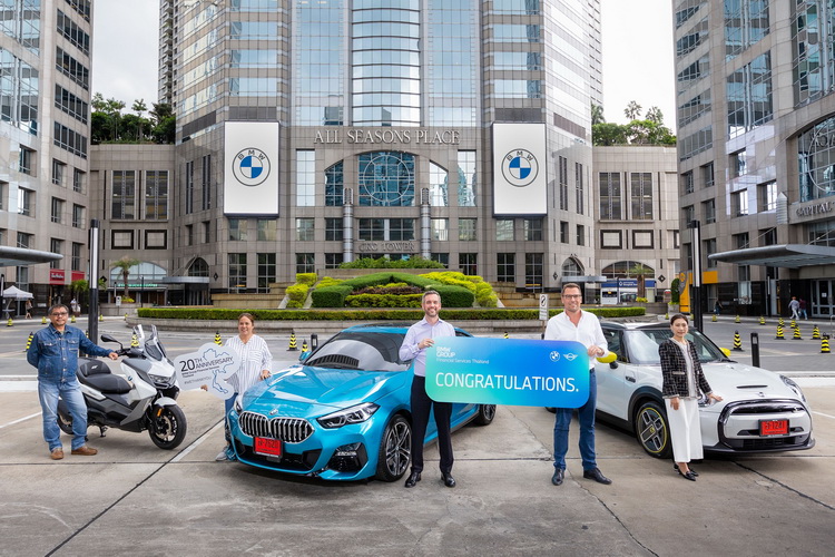 บีเอ็มดับเบิลยู ไฟแนนเชียล เซอร์วิส ประเทศไทย นำโดย มร. บียอร์น แอนทอนส์สัน (ที่ 4 จากซ้าย) ประธานกรรมการบริหาร และ มร. คาร์สเทน สตัมพ์ฟ (ที่ 3 จากซ้าย) ประธานเจ้าหน้าที่ฝ่ายบริหารการเงิน มอบรถยนต์บีเอ็มดับเบิลยู 220i Gran Coupé M Sport รถยนต์พลังงานไฟฟ้ามินิ คูเปอร์ เอสอี และมอเตอร์ไซค์บีเอ็มดับเบิลยู C 400 GT ให้แก่ คุณชนาภา วงษ์จันทร์สาร (ที่ 2 จากซ้าย) คุณปิยรัตน์ กาวิละ (ขวาสุด) และคุณสุวโรจน์ เลิศเวช (ซ้ายสุด) ตามลำดับ ซึ่งเป็นผู้โชคดีจากการจับรางวัลภายใต้แคมเปญเฉลิมฉลองครบรอบ 20 ปี ของบีเอ็มดับเบิลยู ไฟแนนเชียล เซอร์วิส ประเทศไทย ณ อาคารออล ซีซั่นส์ เพลส ถนนวิทยุ เมื่อเร็ว ๆ นี้