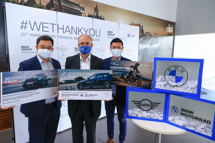 บีเอ็มดับเบิลยู ไฟแนนเชียล เซอร์วิส ประเทศไทย นำโดย มร. วิลฟรีด ลุกซ์ (กลาง) ประธานเจ้าหน้าที่ฝ่ายบริหารการเงิน, คุณองอาจ อรุณแสงโรจน์ (ซ้าย) ผู้อำนวยการฝ่ายขายและการตลาด, และคุณอำนาจ วจนะวิวัฒน์ (ขวา) ผู้จัดการอาวุโส ฝ่ายบริหารแบรนด์ ร่วมในการจับรางวัลให้แก่ลูกค้าผู้โชคดีกลุ่มแรกในการมอบรางวัลประจำเดือน สำหรับแคมเปญเฉลิมฉลองการเดินทางครบรอบ 20 ปีของบีเอ็มดับเบิลยู ไฟแนนเชียล เซอร์วิส ในไทย พร้อมมอบรางวัลรวมมูลค่า 7 ล้านบาท การจับรางวัลดังกล่าวจัดขึ้น ณ ศูนย์ฝึกอบรมบีเอ็มดับเบิลยู กรุ๊ป ประเทศไทย โดยมีคุณปรีชา เบี้ยมุกดา เจ้าพนักงานชำนาญการ กรมการปกครอง กระทรวงมหาดไทย ร่วมเป็นสักขีพยาน