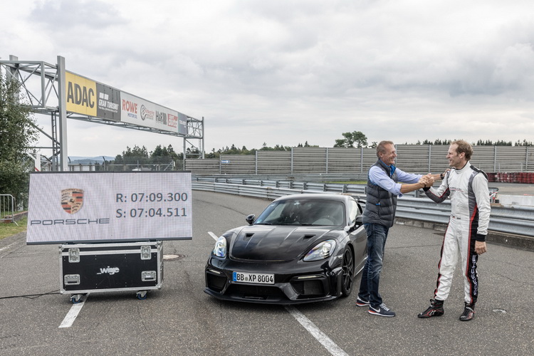 Jörg Bergmeister นักขับทดสอบและ Porsche Brand ambassador สามารถทำเวลาหลังพวงมาลัยรถในสายการผลิตปกติต่อรอบสนาม Nürburgring-Nordschleife ซึ่งมีระยะทาง 20.832 กิโลเมตร ด้วยตัวเลข 7:09.300 นาที ทั้งนี้ ปอร์เช่ 718 เคย์แมน จีที4 อาร์เอส ใหม่ (The new Porsche 718 Cayman GT4 RS) สามารถวิ่งครบรอบสนาม ใช้เวลาเพียง 7:04.511 นาที ในระยะทาง 20.6 กิโลเมตร ซึ่งเร็วกว่าสถิติเดิมที่ 718 เคย์แมน จีที4 (718 Cayman GT4) ที่ทำไว้ถึง 23.6 วินาที และเพื่อป้องกันอันตรายที่อาจเกิดขึ้นกับผู้ขับขี่ขณะทดสอบ รถสปอร์ตเครื่องยนต์ วางกลางคันดังกล่าว จึงได้รับการติดตั้งเบาะนั่งสำหรับการแข่งขัน และยางรถยนต์ Michelin Pilot Sport Cup 2 R ที่สามารถเลือกสั่งเป็นอุปกรณ์พิเศษเพิ่มเติมได้ โดยจะมีเจ้าหน้าที่ให้การรับรองมาตรฐานในเรื่องของสภาพตัวรถและน้ำหนัก