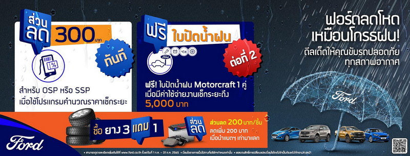 รับใบปัดน้ำฝน Motorcraft คู่หน้าฟรี เมื่อมีค่าใช้จ่ายงานเช็คระยะตั้งแต่ 5,000 บาท สำหรับลูกค้ารถยนต์ฟอร์ดทุกรุ่น ยกเว้นรถฟอร์ดเรนเจอร์ เจเนอเรชันใหม่ และ ฟอร์ด เทอริทอรี จะได้รับใบปัดน้ำฝนคู่หน้ารุ่นเดียวกับที่ติดตั้งจากโรงงาน โดยฟอร์ดยังมอบบริการพ่นฆ่าเชื้อภายในรถยนต์ฟรี