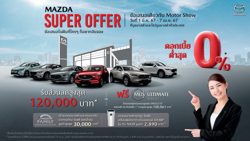 ตีเหล็กต้องตีตอนร้อน หลังประสบความสำเร็จอย่างสูงจากแคมเปญ Mazda Season of Luck เมื่อเดือนกุมภาพันธ์ที่ผ่านมา มาสด้าไม่รอช้าอัดข้อเสนอสุดร้อนแรงต่อเนื่องรับเดือนมีนาคม กับแคมเปญ Mazda Super Offer ข้อเสนอในฝันที่ใครๆ ก็อยากจับจอง ซึ่งเป็นข้อเสนอเดียวกับงานมอเตอร์โชว์ รับดอกเบี้ยต่ำสุด 0% ส่วนลดสูงสุด 120,000 บาทฟรีโปรแกรมคุ้มครองและดูแลรถ Mazda Ultimate Service (MUS) 5 ปี* ฟรีประกันภัยชั้น 1 Mazda Premium Insurance รวมมูลค่าสูงสุด 100,861 บาท* เมื่อจองรถมาสด้าทุกรุ่นรับฟรีเครื่องฟอกอากาศในรถยนต์ มูลค่า 2,890 บาท นอกจากนี้ มาสด้ายังมอบข้อเสนอเพิ่มเติมสำหรับ Mazda Family หรือ เจ้าของรถยนต์มาสด้าและครอบครัว เมื่อออกรถใหม่ รับฟรีบัตรน้ำมันมูลค่าสูงสุด 30,000 บาท ตั้งแต่วันที่ 1 มี.ค. 67 – 7 เม.ย. 67 ที่โชว์รูมมาสด้าทั่วประเทศและที่บูธมาสด้าในงานมอเตอร์โชว์ที่กำลังจะมาถึงในเร็วๆ นี้เงื่อนไขเป็นไปตามที่บริษัทฯ กำหนด
