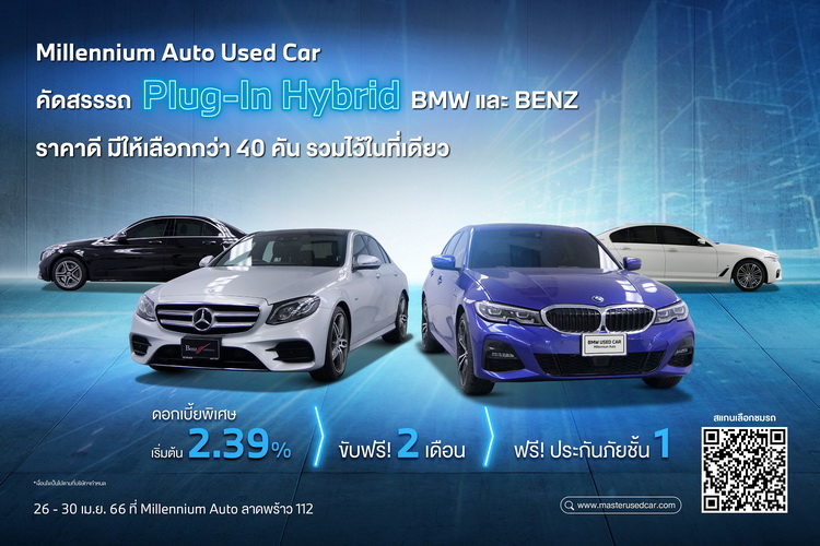 บริษัท มาสเตอร์ เซอร์ทิฟายด์ยูสคาร์ จำกัด ศูนย์รวมรถยนต์มือสองครบวงจร ภายใต้กลุ่มบริษัท มิลเลนเนียม กรุ๊ป คอร์ปอเรชั่น (เอเชีย) จำกัด (มหาชน) จัดกิจกรรมพิเศษสำหรับผู้ชื่นชอบยนตรกรรมยุโรปที่มาพร้อมขุมพลังปลั๊ก-อินไฮบริด ยกทัพยนตรกรรม บีเอ็มดับเบิลยู และ เบนซ์ (PHEV) ไมล์น้อย สภาพดี การันตีคุณภาพ กว่า 40 คัน พร้อมข้อเสนอสุดพิเศษ มาให้ลูกค้าได้เลือกสรรแบบจุใจ ระหว่างวันที่ 26-30 เมษายน นี้ ที่โชว์รูม มิลเลนเนียม ออโต้ สาขาลาดพร้าว 112
