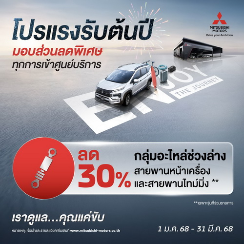 บริษัท มิตซูบิชิ มอเตอร์ส (ประเทศไทย) จำกัด เปิดตัวแคมเปญบริการหลังการขายสุดพิเศษสำหรับเจ้าของรถมิตซูบิชิ ที่หมดระยะเวลาการรับประกัน ด้วยการมอบส่วนลดร้อยละ 30 สำหรับกลุ่มอะไหล่ช่วงล่าง สายพานหน้าเครื่อง และสายพานไทม์มิ่งที่ร่วมรายการ ช่วยให้ลูกค้าอุ่นใจ คลายกังวลในการใช้งานรถยนต์ที่มีสมรรถนะและความปลอดภัยแม้หมดระยะเวลาการรับประกัน ลูกค้าสามารถนำรถเข้ารับบริการได้ตั้งแต่วันนี้ จนถึงวันที่ 31 มีนาคม 2568