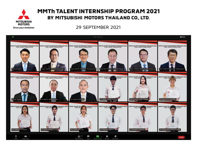 บริษัท มิตซูบิชิ มอเตอร์ส (ประเทศไทย) จำกัด นำโดย มร. เออิอิชิ โคอิโตะ (แถวบน ซ้ายสุด) กรรมการผู้จัดการใหญ่ เป็นประธานในพิธีเพื่อแสดงความยินดีและมอบรางวัลให้แก่นิสิตนักศึกษาฝึกงานที่สำเร็จหลักสูตรในโครงการนักศึกษาฝึกงานประจำปี 2564 โดยมี รองศาสตราจารย์ ดร.ธีร เจียศิริพงษ์กุล (แถวบน ที่ 2 จากซ้าย) คณบดีคณะวิศวกรรมศาสตร์ มหาวิทยาลัยธรรมศาสตร์ รองศาสตราจารย์ ดร.ธวัชชัย ชรินพาณิชกุล (แถวบน ที่ 3 จากซ้าย) รองคณบดีคณะวิศวกรรมศาสตร์ จุฬาลงกรณ์มหาวิทยาลัย ผู้ช่วยศาสตราจารย์ ดร. อิทธิเศก นิลกำแหง (แถวบน ที่ 3 จากขวา) รองผู้อำนวยการฝ่ายวิเทศและองค์กรสัมพันธ์ สถาบันเทคโนโลยีนานาชาติสิรินธร มหาวิทยาลัยธรรมศาสตร์ รองศาสตราจารย์ ดร.เพชร เจียรนัยศิลาวงศ์ (แถวบน ที่ 2 จากขวา) รองคณบดีฝ่ายบริหารคณะวิศวกรรมศาสตร์ มหาวิทยาลัยเทคโนโลยีพระจอมเกล้า พระนครเหนือ ผู้ช่วยศาสตราจารย์ ดร.เปี่ยมภูมิ สฤกพฤกษ์ (แถวบน ขวาสุด) รองคณบดีคณะวิศวกรรมศาสตร์ สถาบันเทคโนโลยีพระจอมเกล้าเจ้าคุณทหารลาดกระบัง พร้อมด้วยผู้บริหารจาก มิตซูบิชิ มอเตอร์ส ประเทศไทย ร่วมเป็นเกียรติในพิธี โดยโครงการนักศึกษาฝึกงานนี้ได้เปิดโอกาสให้นักศึกษาระดับชั้นอุดมศึกษาจากทั่วประเทศได้เข้ามาฝึกงานร่วมกับ มิตซูบิชิ มอเตอร์ส ประเทศไทย ผู้ผลิตรถยนต์ชั้นนำและส่งออกรายใหญ่ของประเทศไทย เพื่อเรียนรู้กระบวนการผลิตรถยนต์ด้วยเทคโนโลยีล้ำสมัย ส่งเสริมการนำความรู้จากห้องเรียนมาประยุกต์ใช้กับการลงมือปฏิบัติงานจริงโดยทำงานร่วมกับวิศวกรผู้เชี่ยวชาญ เตรียมความพร้อมสู่การทำงานในอนาคตภายหลังจบการศึกษา