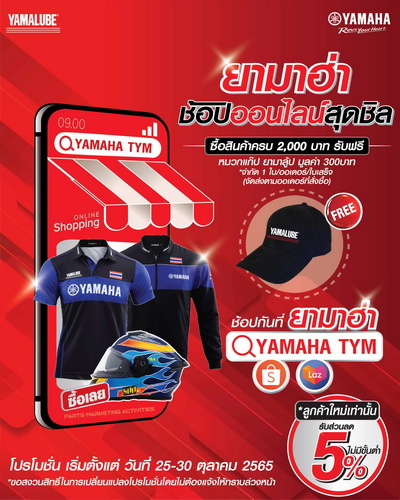 บริษัท ไทยยามาฮ่ามอเตอร์ จำกัด จัดโปรโมชั่นช้อปปิ้งออนไลน์สุดพิเศษผ่านแพลตฟอร์มออนไลน์ ของ Shopee, Lazada และ Line Shopping ด้วยโปรพิเศษสุด! เมื่อซื้อสินค้าครบ 2,000 บาท รับฟรี! หมวกแก๊ป YAMALUBE มูลค่า 300 บาท ฟรีทันที 1 ใบ (จำกัด 1 ใบ/ออเดอร์/ใบเสร็จ) เริ่มตั้งแต่วันที่ 25 – 30 ตุลาคม 2565 นี้ พิเศษ สำหรับลูกค้าใหม่ร้าน YAMAHA TYM จาก Shopee และ Lazada กดติดตามร้านค้า รับส่วนลด 5% ทันทีเมื่อซื้อสินค้าทั้งร้านไม่มีขั้นต่ำ พร้อมดีลสุดพิเศษสำหรับลูกค้า YAMAHA TYM ผ่าน Line Shopping รับเลยคูปองส่วนลด 5% ไม่มีขั้นต่ำ สำหรับซื้อสินค้าทั้งร้านพร้อมส่งฟรีทุกออเดอร์ พร้อมกับสิทธิ์พิเศษรับ 150 พอยต์/คำสั่งซื้อ เมื่อชำระผ่านบัตรเครดิต/เดบิต หรือ Rabbit Line Pay เพื่อนำมาเป็นส่วนลดแทนเงินสดได้ #เพราะ 1 พอยต์เท่ากับ 1 บาท