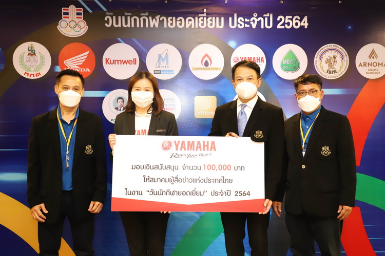 นางสาวอัญชลี ศรีพิทักษ์ ผู้จัดการส่วนบริหารตราสินค้า ประชาสัมพันธ์ และลูกค้าสัมพันธ์ บริษัท ไทยยามาฮ่ามอเตอร์ จำกัด มอบเงินจำนวน 100,000 บาท ให้กับสมาคมผู้สื่อข่าวกีฬาแห่งประเทศไทย โดยมีนายวรวุฒิ พงษ์ธีระพล นายกสมาคมผู้สื่อข่าวกีฬาแห่งประเทศไทย เป็นผู้รับมอบ เพื่อสนับสนุนในงาน “วันนักกีฬายอดเยี่ยม” ประจำปี 2564 เพื่อเชิดชูเกียรติแก่นักกีฬาอาชีพ นักกีฬาสมัครเล่น และนักกีฬาพิการที่สร้างผลงาน และสร้างชื่อเสียงให้กับประเทศไทยในปี 2564 ที่ผ่านมา โดยการมอบเงินสนับสนุนในครั้งนี้มีขึ้น ณ โรงแรมอโนมา แกรนด์ ราชประสงค์ เมื่อเร็วๆ นี้