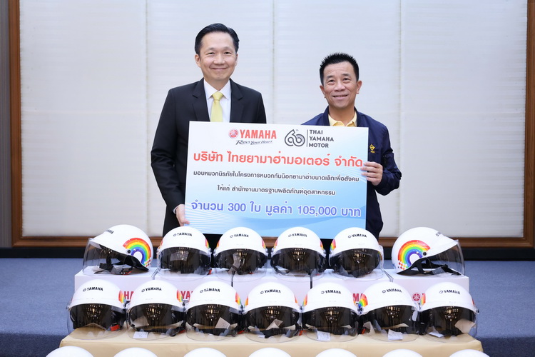 นายพงศธร เอื้อมงคลชัย ประธานกรรมการบริหาร พร้อมคณะผู้บริหาร บริษัท ไทยยามาฮ่ามอเตอร์ จำกัด ร่วมกันส่งมอบหมวกกันน็อกขนาดเล็ก จำนวน 300 ใบ รวมมูลค่า 105,000 บาท ให้กับนายวันชัย พนมชัย เลขาธิการสำนักงานมาตรฐานผลิตภัณฑ์อุตสาหกรรม นางสาวกนกวรรณ พรหมณเรศ ผู้อำนวยการกองควบคุมมาตรฐาน พร้อมคณะเจ้าหน้าที่สำนักงานมาตรฐานผลิตภัณฑ์อุตสาหกรรม (สมอ.) กระทรวงอุตสาหกรรม ร่วมกันรับมอบ โดยการส่งมอบหมวกกันน็อกขนาดเล็กเป็นโครงการที่ยามาฮ่าเห็นถึงความสำคัญของผู้ใช้รถจักรยานยนต์ในประเทศไทยที่ยังไม่มีหมวกกันน็อกขนาดเล็กที่ได้มาตรฐานอุตสาหกรรมใช้สวมป้องกันศีรษะขณะขับขี่ หรือโดยสารรถจักรยานยนต์ และได้ถือโอกาสในการฉลองครบรอบ 60 ปี ในการก่อตั้ง บริษัท ไทยยามาฮ่ามอเตอร์ จำกัด ร่วมมือกันผลิตหมวกกันน็อกขนาดเล็กกับบริษัทเอกชน และได้ผ่านการทดสอบมาตรฐานอุตสาหกรรมจาก สำนักงานมาตรฐานผลิตภัณฑ์อุตสาหกรรม (สมอ.) กระทรวงอุตสาหกรรม เพื่อนำไปแจกจ่ายให้กับประชาชนทั่วประเทศ จำนวนทั้งสิ้น 12,000 ใบ สำหรับการส่งมอบหมวกกันน็อกขนาดเล็กในครั้งนี้ทาง สำนักงานมาตรฐานผลิตภัณฑ์อุตสาหกรรม (สมอ.) กระทรวงอุตสาหกรรม จะนำไปแจกจ่ายให้กับประชาชนทั่วประเทศ โดยการส่งมอบในครั้งนี้ มีขึ้น ณ ห้องประชุม 200 อาคาร สำนักงานมาตรฐานผลิตภัณฑ์อุตสาหกรรม (สมอ.) กระทรวงอุตสาหกรรม เมื่อเร็วๆ นี้