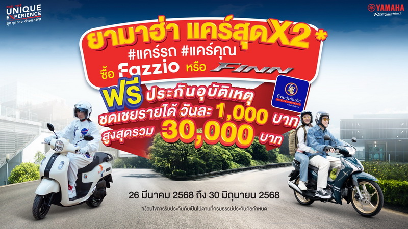 บริษัท ไทยยามาฮ่ามอเตอร์ จำกัด ร่วมกับ บริษัท ทิพยประกันภัย จำกัด (มหาชน) ส่งมอบประสบการณ์สุดมั่นใจ ให้กับลูกค้ารถจักรยานยนต์ยามาฮ่า ฟาซซิโอ้ หรือยามาฮ่า ฟินน์ ในแคมเปญ “แคร์สุดx2” #แคร์รถ #แคร์คุณ รับฟรี! ประกันอุบัติเหตุ (จากอุบัติเหตุทั่วไปหรืออุบัติเหตจากการขับขี่ หรือโดยสาร) สูงสุด 5,000 บาท/ปี และคุ้มครองชดเชยรายได้ระหว่างเข้ารับการรักษาตัวที่โรงพยาบาลจำนวน 1,000 บาท/วัน (สูงสุด 3 วัน/อุบัติเหตุแต่ละครั้ง และไม่เกิน 30 วัน/ปี) จากทิพยประกันภัย นาน 1 ปี เพื่อเพิ่มความมั่นใจให้กับลูกค้ายามาฮ่า นอกเหนือจากการรับประกัน 5 ปี เจ้าแรกในวงการรถจักรยานยนต์ที่ยามาฮ่า #แคร์รถ แล้ว เรายัง #แคร์คุณ ด้วยการมอบประกันอุบัติเหตุ คุ้มครองชดเชยรายได้ ตอบสนองทุกประสบการณ์การเดินทางของลูกค้า ให้ลูกค้ายามาฮ่าได้ท่องเที่ยว และใช้ชีวิตได้อย่างไม่ต้องกังวล ตั้งแต่วันที่ 26 มีนาคม ถึง 30 มิถุนายน 2568 นี้