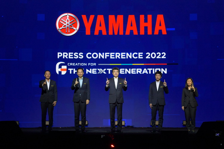 มร.ทัตซึยะ โนซากิ ประธานกรรมการบริหาร นายพงศธร เอื้อมงคลชัย รองประธานกรรมการบริหาร พร้อมด้วยผู้บริหารระดับสูง บริษัท ไทยยามาฮ่ามอเตอร์ จำกัด ถ่ายภาพร่วมกันในงาน YAMAHA PRESS CONFERENCE 2022 F CREATION FOR THE NEXT GENERATION โดยภายในงานยามาฮ่าได้แถลงถึงการเติบโตของตลาดรถจักรยานยนต์ในประเทศไทยหลังฝ่าวิกฤติโควิด-19 โดยมียอดจดทะเบียนเพิ่มขึ้น 1.3% เมื่อเทียบกับปีที่ผ่านมาโดยตลาดรถจักรยานยนต์ยามาฮ่าเติบโตขึ้นถึง 5.8 % ซึ่งยามาฮ่าตั้งเป้าปิดยอดการขายปลายปี 65 ที่ 287,000 คัน และมีเป้าหมายที่จะครองส่วนแบ่งทางการตลาดเพิ่มเป็น 17.5% ผ่านการสร้างความแข็งแกร่งของแบรนด์ตามหลัก KANDO พร้อมเสริมความแข็งแกร่งให้กับแบรนด์ยามาฮ่าเพื่อสร้าง Lifetime Customers และเดินหน้าขยายโชว์รูมรูปแบบใหม่ และร่วมฉลองความสำเร็จ 20 ปี แห่งความเป็นผู้นำตลาดรถจักรยานยนต์ออโตเมติกในประเทศไทย