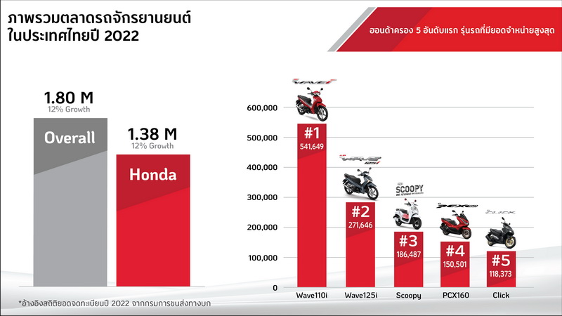 ในปี 2022 นี้ รถจักรยานยนต์ฮอนด้าปิดตัวเลขที่ 1.38 ล้านคัน เติบโตขึ้น 12% เท่ากับตลาดรวม โดย 5 โมเดลแรกที่มียอดจำหน่ายสูงสุดยังคงเป็นฮอนด้า นำโดย Honda Wave110i ที่มีตัวเลขอยู่ที่ 541,649 คัน ตามด้วยอันดับที่ 2 คือ Honda Wave125i มียอดจำหน่ายที่ 271,646 คัน อันดับที่ 3 เป็น Honda Scoopyมียอดจำหน่ายอยู่ที่ 186,487 คัน อันดับที่ 4 คือ Honda PCX160 ด้วยยอดจำหน่ายที่ 150,501 คัน และอันดับที่ 5 Honda Click Series ที่มียอดจำหน่ายอยู่ที่ 118,373 คัน จากตัวเลขดังกล่าวทำให้ Honda Wave110i ครองความเป็นที่ 1 ในกลุ่มรถครอบครัว และมี Honda Scoopyครองอันดับ 1 ในกลุ่มรถเอ.ที. และในส่วนของกลุ่มรถสปอร์ต Honda CRF300L มียอดจำหน่ายสูงสุดในกลุ่มนี้ที่ 6,577 คัน ในปี 2023 คาดการณ์ว่าตลาดรวมในปีนี้จะอยู่ที่ 1.75 ล้านคัน โดยฮอนด้าตั้งเป้าไว้ที่ 1.38 ล้านคัน เท่ากับปีที่ผ่านมา