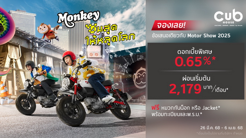 CUB House by Honda ยกขบวนข้อเสนอที่ดีที่สุดแห่งปีมาให้ลูกค้าอย่างครบครันในงาน Motor Show 2025 ไม่ว่าจะชอบขับขี่รถจักรยานยนต์สไตล์ไหน Monkey, C125, CT125 หรือ Dax ก็พร้อมให้คุณเลือกเป็นเจ้าของสะท้อนความเป็นตัวเองด้วยข้อเสนอสุดเอ็กซ์คลูซีฟ ทั้งดอกเบี้ยพิเศษ 0.65% (เฉพาะรุ่น) พร้อมของแถมสุดพรีเมียมเฉพาะในงาน รวมถึงสิทธิพิเศษอีกมากมาย จัดเต็มเฉพาะลูกค้าที่จองรถจักรยานยนต์ CUB House ในระหว่างวันที่ 26 มีนาคม 2568 – 6 เมษายน 2568 เท่านั้น!