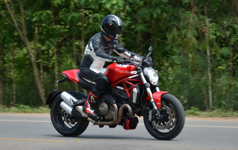 ถึงตัวรถจะมีขนาดตัวถังใหญ่กว่า 796 โดยมีน้ำหนักตัว 209 กก.ก็ตาม แต่การควบคุมก็ทำได้ไม่ยากจากแฮนด์ที่กว้างแบบรถวิบาก ช่วยลดแรงในการหักเลี้ยวได้เยอะ รวมถึงการบาลานซ์น้ำหนักที่ดีส่งผลให้การทรงตัวในความเร็วต่ำๆ ก็ไม่เหนื่อยมาก แต่เวลาเดินทางไกลระดับเบาะปกติจะให้ความรู้สึกในการควบคุมรถได้ดีกว่า จากท่านั่งที่เอนมาทางด้านหน้ามากกว่าเบาะเตี้ยๆ อีกทั้งเบาะที่กว้างช่วยให้มีพื้นที่ขยับก้นบ้างเมื่อต้องการจะหมอบลดกระแสลมปะทะได้อีกต่างหาก