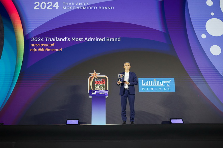 นางสาวจันทร์นภา สายสมร ประธานเจ้าหน้าที่บริหาร บจก.เทคโนเซล (เฟรย์) ผู้นำเข้าและจัดจำหน่ายฟิล์มกรองแสงติดรถยนต์และอาคารลามิน่า รับรางวัล Thailand’s Most Admired Brand 2024 : แบรนด์ที่ผู้บริโภคเชื่อมั่นสูงสุดในประเทศไทย ต่อเนื่องเป็นปีที่ 10“ลามิน่าฟิล์ม” ตอกย้ำความเป็นแบรนด์ฟิล์มกรองแสงรถยนต์อันดับ 1 ในใจผู้บริโภค ได้รับรางวัล Thailand’s Most Admired Brand 2024 แบรนด์ที่ผู้บริโภคเชื่อมั่นสูงสุดในประเทศไทย ต่อเนื่องเป็นปีที่ 10 จัดโดยนิตยสารแบรนด์เอจ ผู้ออกแบบและจัดทำผลสำรวจความแข็งแกร่งของแบรนด์ร่วมกับ ชูโอ เซนโก เอเชีย รีเสิร์ชเฮาส์