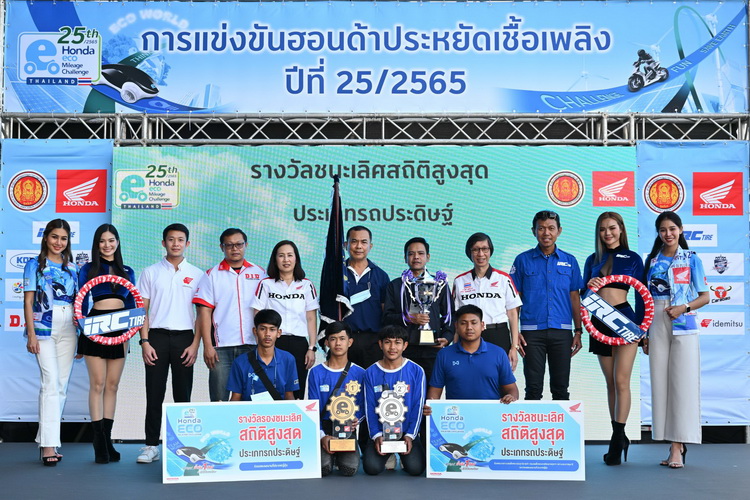 บริษัท ไทยฮอนด้า จำกัด ร่วมกับ สำนักงานคณะกรรมการการอาชีวศึกษา เดินหน้าจุดพลังฝันเยาวชนไทย จัดการแข่งขัน “ฮอนด้าประหยัดเชื้อเพลิง” Honda Eco Mileage Challenge ครั้งที่ 25 ประจำปี 2566 เปิดสังเวียนแข่งระดับโลกให้เด็กอาชีวศีกษา และอุดมศึกษา ร่วมโชว์ฝีมือออกแบบ และประดิษฐ์ยานยนต์ประหยัดน้ำมันเชื้อเพลิงได้มากที่สุด เพื่อโลกอนาคต ภายใต้โจทย์ “ท้าทายพลังความคิด ประดิษฐ์นวัตกรรมรักษ์โลก ท้าพิสูจน์น้ำมัน 1 ลิตร จะวิ่งได้ไกลแค่ไหน” เมื่อวันที่ 11-12 มกราคม 2566 ที่ผ่านมา ณ สนามช้าง อินเตอร์เนชั่นแนล เซอร์กิต จ.บุรีรัมย์ โดยมีจำนวนทีมเข้าร่วมเข้าทำการแข่งขันมากถึง 351 ทีม หรือกว่า 1,700 คนจากทั่วประเทศภายหลังการชิงชัยกันอย่างเข้มข้นผลการแข่งขัน “ฮอนด้าประหยัดเชื้อเพลิง” Honda Eco Mileage Challenge ครั้งที่ 25 ปรากฏว่า รางวัลชนะเลิศ ประเภทรถประดิษฐ์ ระดับอาชีวศึกษา ตกเป็นของทีมศรีวิชัย หมายเลขรถ 179 จากวิทยาลัยเทคนิค สุราษฎร์ธานี จ.สุราษฎร์ธานี ภายใต้การสนับสนุนของ บจก.ศุภกิตติ์มอเตอร์สุราษฎร์ธานี โดยมีสถิติค่าประหยัดน้ำมันสูงที่สุดอยู่ที่ 1,032.039 กม./ลิตร ด้วยความเร็วเฉลี่ย 30.240 กม./ชม.