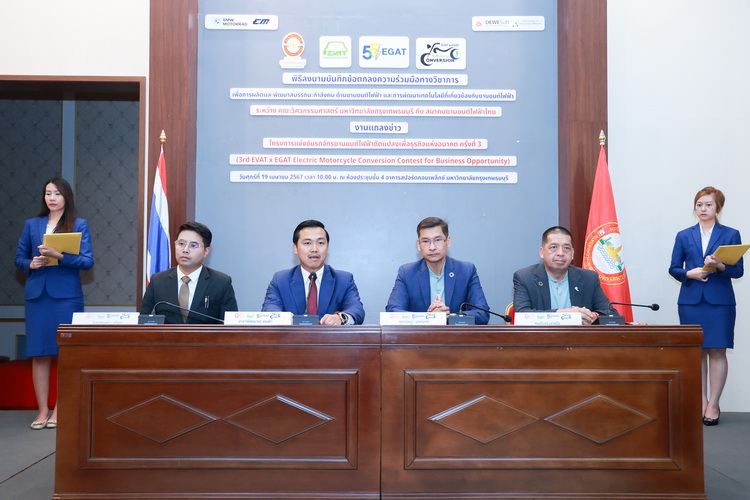 สมาคมยานยนต์ไฟฟ้าไทย (EVAT) นำโดย นายกฤษฎาอุตตโมทย์ นายกสมาคมฯ พร้อมด้วย นายชัยวุฒิ หลักเมือง ผู้ช่วยผู้ว่าการบริหารจัดการความยั่งยืน การไฟฟ้าฝ่ายผลิตแห่งประเทศไทย (กฟผ.) เเละ อาจารย์สมมาตร ทองคำ คณบดีคณะวิศวกรรมศาสตร์ มหาวิทยาลัยกรุงเทพธนบุรี จัดงานเเถลงข่าวโครงการแข่งขันรถจักรยานยนต์ไฟฟ้าดัดแปลงเพื่อธุรกิจแห่งอนาคต ครั้งที่ 3 และ พิธีลงนามบันทึกข้อตกลงความร่วมมือทางวิชาการ เพื่อการผลิตและพัฒนาสมรรถนะกำลังคนด้านยานยนต์ไฟฟ้า และการพัฒนาเทคโนโลยีที่เกี่ยวข้องกับยานยนต์ไฟฟ้า ระหว่างคณะวิศวกรรมศาสตร์ มหาวิทยาลัยกรุงเทพธนบุรี กับ สมาคมยานยนต์ไฟฟ้าไทย ณ ห้องประชุมชั้น 4 อาคารสปอร์ตคอมแพล็ค มหาวิทยาลัยกรุงเทพธนบุรี