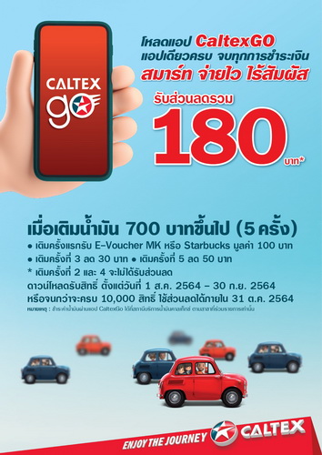 บริษัท เชฟรอน (ไทย) จำกัด ผู้ให้บริการสถานีบริการน้ำมันคุณภาพระดับโลกภายใต้แบรนด์ “คาลเท็กซ์” จัดโปรโมชั่นปัง ๆ เพิ่มความคุ้มค่าทุกการจับจ่าย เพียงลูกค้าคาลเท็กซ์ใช้บริการเติมน้ำมันชนิดใดก็ได้ (ยกเว้น ดีเซล B20) ที่สถานีบริการน้ำมันคาลเท็กซ์ที่ร่วมรายการ (เฉพาะในจังหวัดกรุงเทพฯ และปริมณฑล ชลบุรี ระยอง ฉะเชิงเทรา และจันทบุรี) ตั้งแต่ 700 บาทขึ้นไป (ครบ 5 ครั้ง) และชำระค่าน้ำมันด้วยแอปพลิเคชัน CaltexGO รับทันทีคูปองอิเล็กทรอนิกส์ (E-Coupon) ส่วนลดต่าง ๆ มูลค่ารวมสูงสุด 180 บาท อาทิ ส่วนลดที่ร้าน MK Restaurants, ร้าน Starbucks หรือรับส่วนลดค่าน้ำมันที่สถานีบริการน้ำมันคาลเท็กซ์ที่ร่วมรายการ ลูกค้าคาลเท็กซ์สามารถดาวน์โหลดแอปพลิเคชัน CaltexGO ได้ตั้งแต่วันนี้ สำหรับระบบปฏิบัติการ IOS สามารถดาวน์โหลดได้จาก App Store และสำหรับระบบปฏิบัติการ Android สามารถดาวน์โหลดได้จาก Play Store โดยสามารถรับสิทธิ์ในการเข้าร่วมแคมเปญ ตั้งแต่วันนี้ – 30 กันยายน 2564 หรือจนกว่าจะครบ 10,000 สิทธิ์