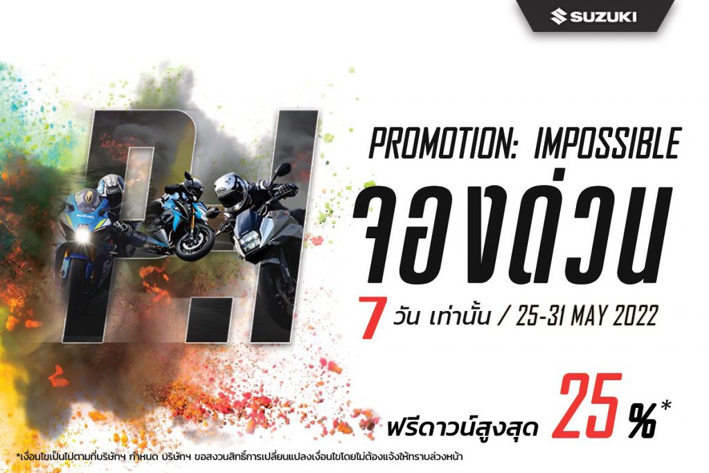 ซูซูกิ จัดโปรโมชั่นเอาใจแฟน ๆสายลับทุกคนด้วย โปรฯ อิมพอสซิเบิ้ล ที่ไม่ว่าสายลับในดวงใจใครมาเห็นก็คงต้องตามสืบกันเลยว่าทำไม ซูซูกิ ให้เยอะขนาดนี้ ไม่ว่าจะเป็น ฟรีดาวน์สูงสุดถึง 25% ประกันภัยชั้น1 บริการช่วยเหลือฉุกเฉิน 24 ชม.*นอกจากนี้จะมีรถรุ่นไหนโปรฯ ไหนให้ตามสืบกันนั้นไปชมกันเลยครับ สำหรับโปรโมชั่น อิมพอสซิเบิ้ล เริ่มตั้งแต่วันที่ 25 – 31 พ.ค. 2565 เท่านั้น รีบจองกันเลย