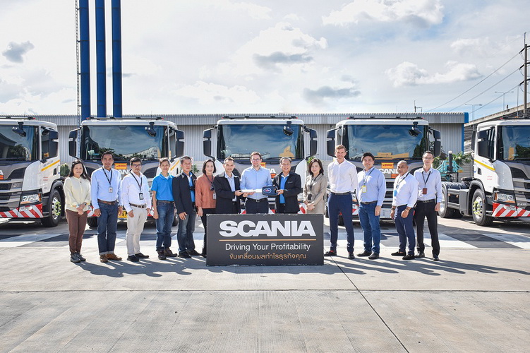 นายลัค มูแลง กรรมการผู้จัดการบริษัทสแกนเนีย สยาม จำกัด (คนกลาง) ร่วมกับนายโจฮัน คลาสัน ผู้อำนวยการฝ่ายขาย และการตลาด และหัวหน้างานด้านความยั่งยืน บริษัท สแกนเนีย สยาม จำกัด (ที่ 4 จากขวา) ร่วมกับนางสาวดวงใจ พงศ์ประเทืองสุข ผู้อำนวยการฝ่ายปฏิบัติการงานขาย บริษัท สแกนเนีย สยาม จำกัด (ที่ 5 จากขวา) เป็นตัวแทนในการส่งมอบรถทรัคสแกนเนีย จำนวน 21 คัน มูลค่ากว่า 80 ล้านบาทอย่างเป็นทางการให้กับนายสุรศักดิ์ บุญรอด ประธานเจ้าหน้าที่บริหาร บริษัทพงษ์ระวี จำกัด (ที่ 6 จากขวา) และนายสมพรชัย โสภาธรรม ประธานเจ้าหน้าที่ปฏิบัติการ บริษัทพงษ์ระวี จำกัด (ที่ 8 จากขวา) ณ สำนักงานใหญ่ สแกนเนีย สยาม